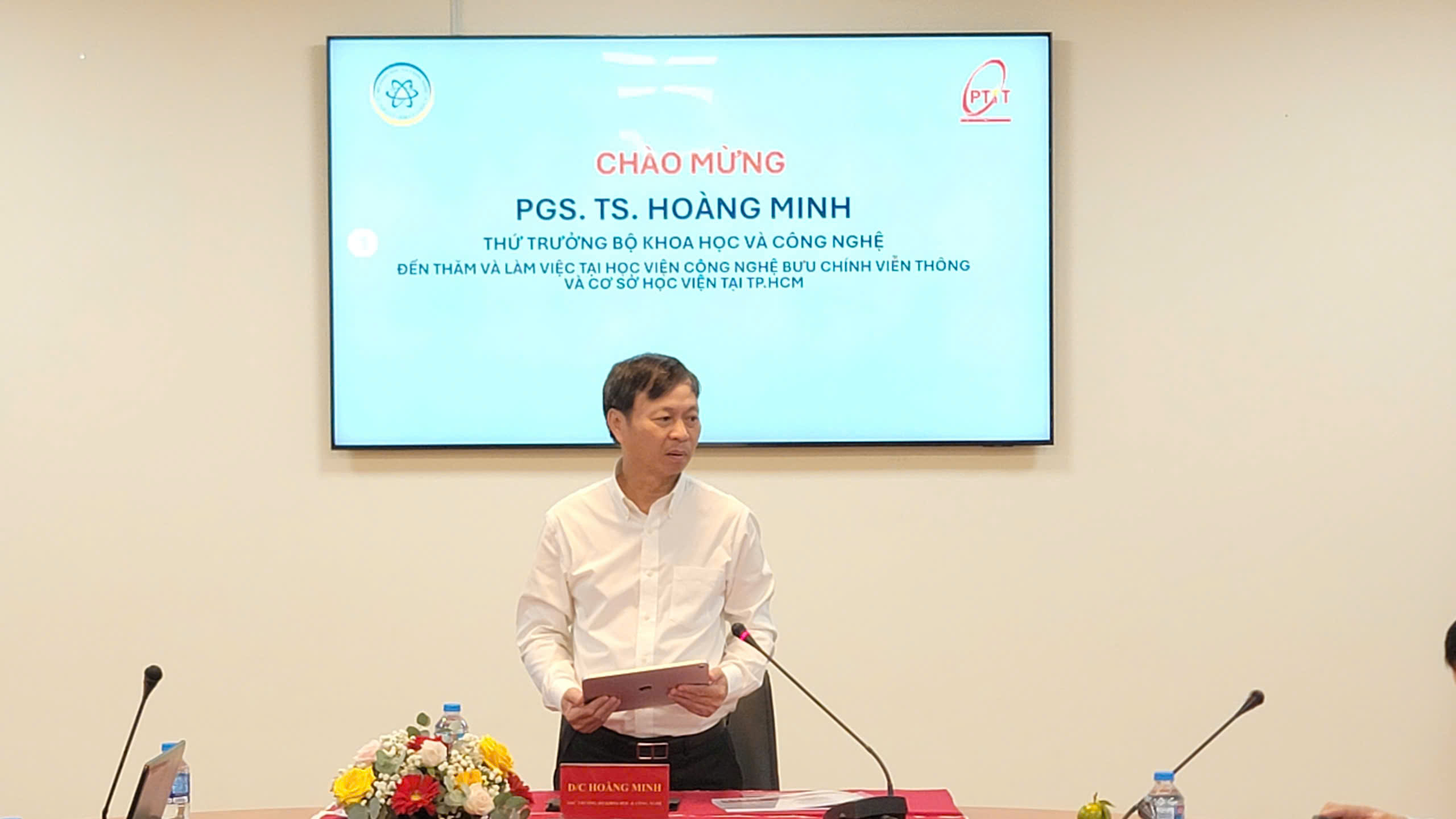 Trong buổi làm việc, Thứ trưởng Hoàng Minh đã gửi lời chúc mừng tập thể lãnh đạo, cán bộ, giảng viên, sinh viên của Học viện nhân Ngày Truyền thống. Đồng thời, Thứ trưởng ghi nhận và đánh giá cao những thành tựu nổi bật mà Học viện đã đạt được trong đào tạo, nghiên cứu khoa học và chuyển giao công nghệ, đóng góp thiết thực cho sự phát triển của ngành Bưu chính – Viễn thông và lĩnh vực công nghệ thông tin – truyền thông của đất nước.